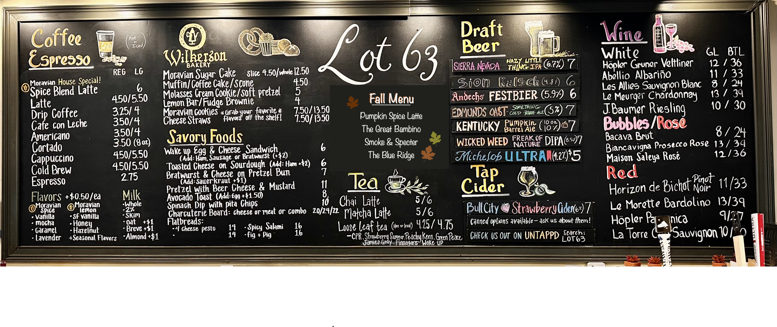 In the heart of Winston-Salem, the historic Old Salem serves as a time capsule of the town's unique Moravian origin. Named after the building's historic designated plot number, Lot 63 serves coffee, tea, beer, wine, savory food to be enjoyed any time of the day, and traditional Moravian baked goods by Wilkerson Moravian Bakery.