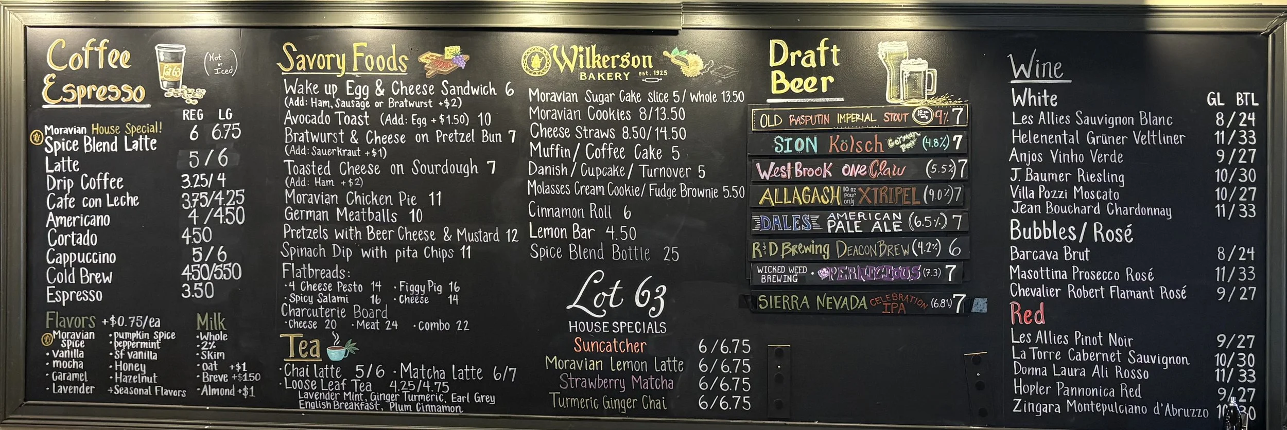 In the heart of Winston-Salem, historic Old Salem stands as a living time capsule of the townβs unique Moravian roots. Named for the buildingβs historic plot designation, Lot 63 offers coffee, tea, beer, wine, and savory fare to be enjoyed throughout the day, alongside traditional Moravian baked goods from